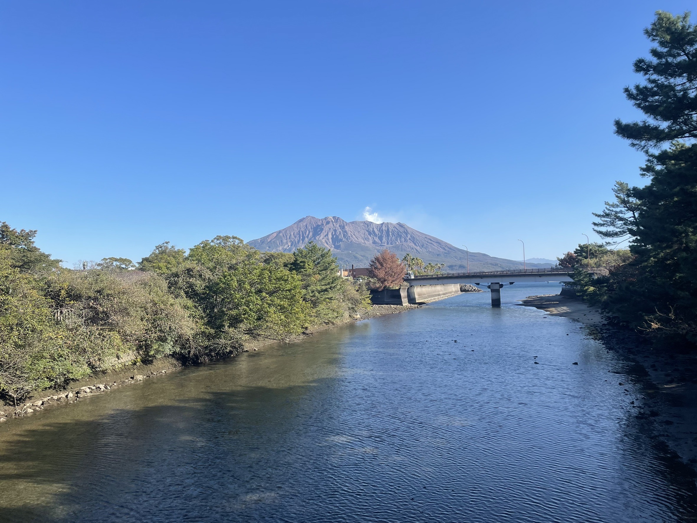 写真は、初詣の帰りに撮った桜島です。緑が多い道を歩いていると、風で木々が揺れる音や、鳥のさえずり、お散歩中の犬に遭遇したりと、とても癒されます。